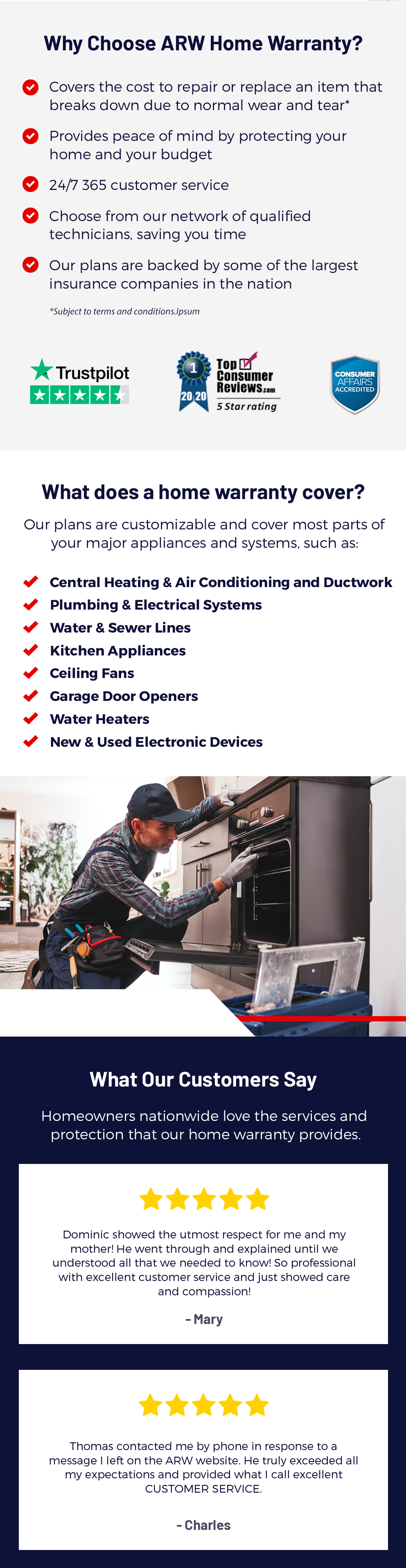 ARW Home, American Residential Warranty and certain other trademarks used on this website are trademarks or registered trademarks of Company or its affiliates. Absent a written license agreement, you may not use these trademarks or any other trademarks belonging to Company or its affiliates except for descriptive purposes. Other trademarks used on this website are the property of their respective owners and are used in this website solely for descriptive purposes. Mention on this website of trademarks held by other parties should not be construed as a challenge to such trademarks' status or ownership.